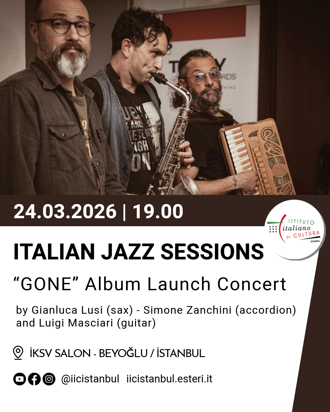 L’Istituto Italiano di Cultura di Istanbul è lieto di presentare il progetto musicale “GONE”, un album di brani originali interpretato da tre straordinari musicisti italiani: il sassofonista Gianluca Lusi, il fisarmonicista Simone Zanchini e il chitarrista Luigi Masciari.